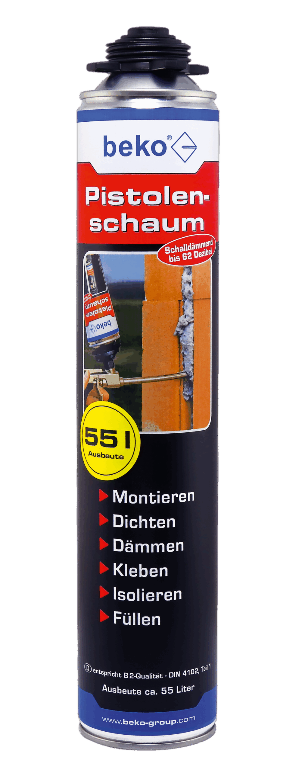 beko Pistolenschaum 750 ml B2: bis 42 L Ausbeute, schneidfähig nach ~35 Min, Schalldämmung bis 56 dB. Überputz-/überstreichbar.