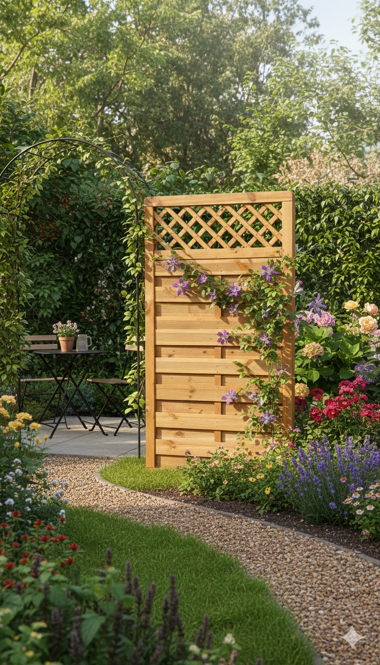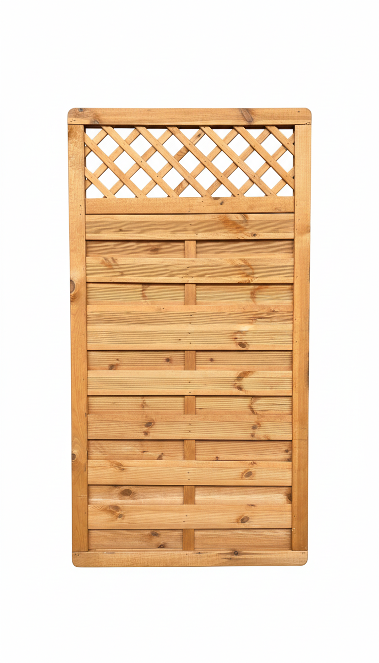 Schmales braun lasiertes Sichtschutzelement mit Gitteraufsatz, ideal zur dezenten Auflockerung von Zaunanlagen.